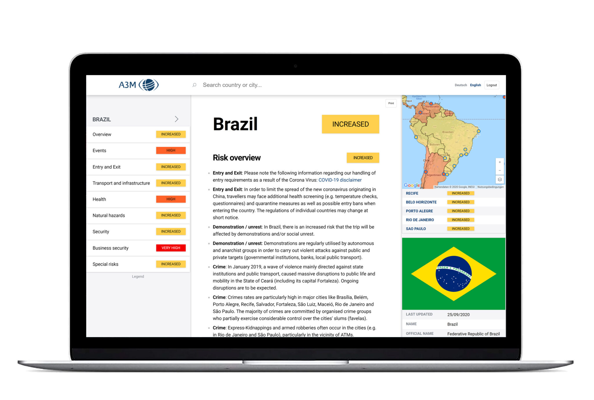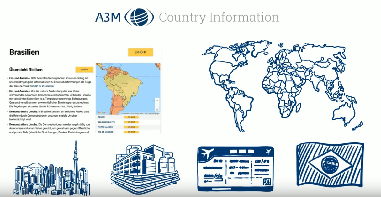 Our Country Information provides comprehensive information on all countries of the world as well as many international metropolises. Thus, corporate clients and business travellers can reliably obtain comprehensive information about potential risk factors in the destination country before they travel and receive valuable advice on how to behave.