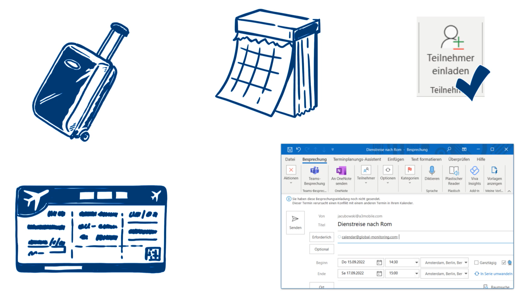 The procedure is very simple: If your employees create their business trips in an online calendar (e.g. Outlook), you only need to invite A3M via a designated e-mail address.