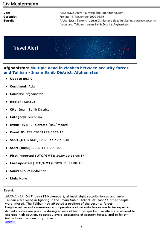 As soon as an event enters the system that corresponds to the parameters, A3M automatically informs the travellers and/or responsible persons such as travel managers.