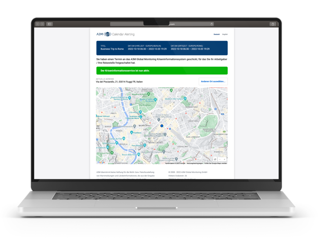 Our global monitoring system then sends an e-mail, which the employee only uses to confirm the trip and whereabouts: This activates the crisis information service via calendar alerting and your employees receive our comprehensive country information and alerts about potential dangers at their whereabouts before they travel.