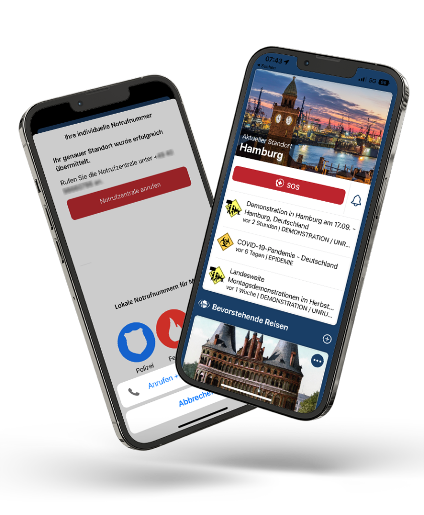 In addition, companies have the option of entering the emergency number of an emergency hotline for assistance services provided by us or you. Whether you have chest pains, questions about foreign characters on medicines or information about German-speaking doctors on site – the red emergency button always provides you with quick help and competent information.