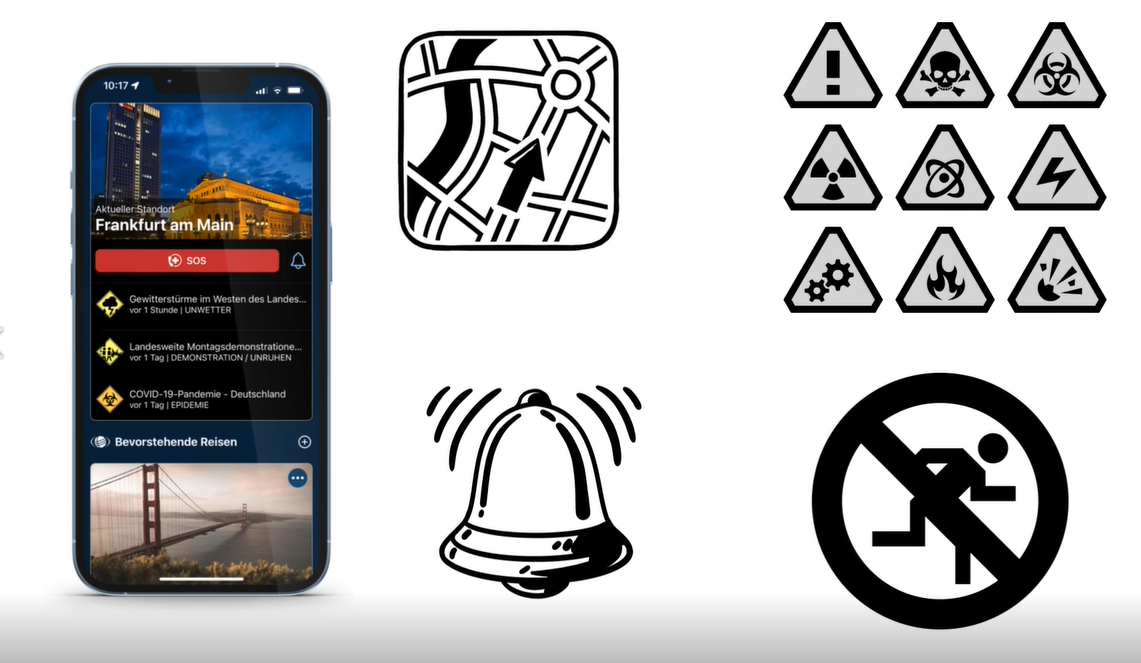 The app uses the current location of the smartphone to provide targeted push notifications about dangers and relevant restrictions at the location and corresponding behavioural instructions. For data protection reasons, the user’s current location cannot be viewed by third parties, but is only used to deliver relevant travel alerts.